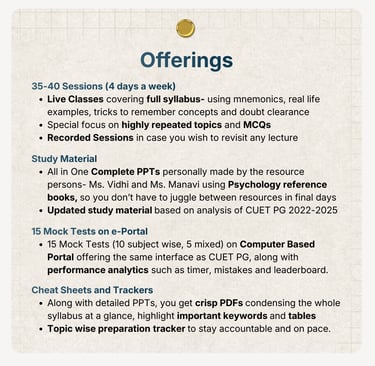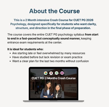 This is a 2 Month intensive Crash Course for CUET PG 2026 Psychology, designed specifically for students who want clarity, structure, and direction in the final phase of preparation.