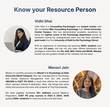 Manavi Jain is pursuing her Master’s in Psychology at Delhi University (North Campus). She has a background in Psychology and Human Resource Management from DU. She scored 280/300 in CUET PG 2024, a result that reflects her consistent effort, genuine interest & dedication. Now, she brings that same clarity and structure into work with students at The Psychlopedia.